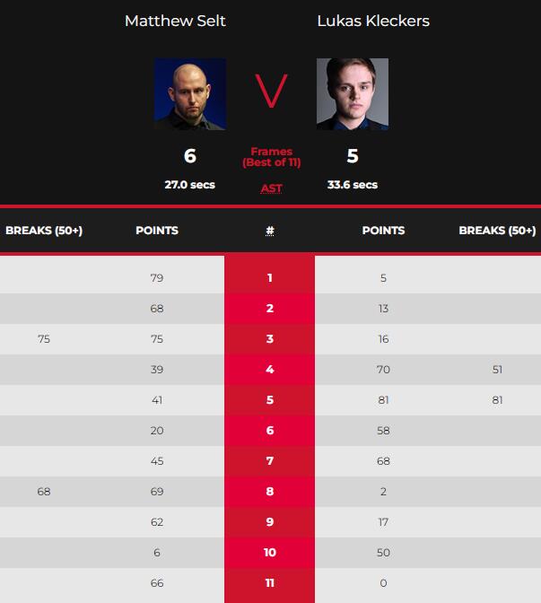 第四局,克莱克斯单杆51分以70:39拿下此局以1-3落后塞尔特。第五局,克莱克斯单杆81分以81:41拿下此局2-3落后塞尔特。第六局,克莱克斯以58:20拿下此局3-3战平塞尔特。