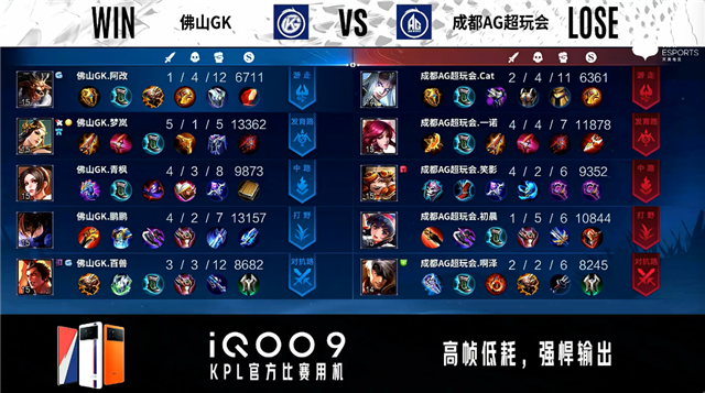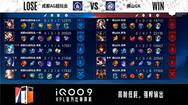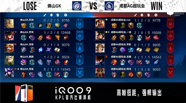 双方常规开局。2分13秒成都AG拿下暴君。5分25秒佛山GK摧毁敌方对抗路外塔。5分55秒成都AG拿下主宰。6分12秒佛山GK摧毁敌方发育路外塔。6分51秒佛山GK拿下暴君。7分28秒野区团战双方1换1。7分46秒成都AG摧毁敌方中路外塔。8分27秒佛山GK摧毁敌方中路外塔。9分10秒佛山GK中路击杀蒙恬。10分45秒成都AG拿下暗影主宰。12分49秒佛山GK拿下暗影暴君。14分56秒团战成都AG打出3换4,澜、马超拿到三连决胜。15分42秒成都AG摧毁敌方中路高地塔。16分46秒成都AG拿下暗影暴君。17分36秒成都AG摧毁敌方发育路二塔。17分47秒高地团战成都AG打出1换2。18分09秒成都AG摧毁敌方水晶拿下比赛。