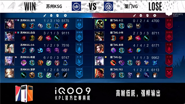 2分10秒,苏州KSG伽罗击杀东皇太一拿下一血。2分27秒,苏州KSG控下暴君。3分39秒,厦门VG橘右京击杀吕布,随后关羽再击杀娜可露露。4分45秒,双方团,苏州KSG打出0换2。5分10秒,苏州KSG吕布下路击杀关羽。6分50秒,苏州KSG控下暴君,随后破掉厦门VG下一塔。8分47秒,中路团,苏州KSG击杀弈星,随后控下先知主宰。9分17秒,苏州KSG破掉厦门VG上一塔。10分20秒,厦门VG橘右京抢到暗影暴君。11分48秒,厦门VG击杀娜可露露,随后破掉苏州KSG上二塔。12分06秒,厦门VG控下暗影主宰。12分15秒,厦门VG破掉苏州KSG中一塔。13分16秒,双方团,厦门VG打出1换2。13分57秒,厦门VG破掉苏州KSG中二塔。15分43秒,双方团战1换1,厦门VG破掉苏州KSG下二塔。16分17秒,厦门VG控下暗影暴君。17分20秒,厦门VG破掉苏州KSG上高地。17分58秒,厦门VG击杀吕布。18分30秒,厦门VG破掉苏州KSG下高地。18分45秒,厦门VG控下暗影暴君。19分45秒,双方团战4换4。21分47秒,双方团,苏州KSG打出1换2。23分20秒,双方团,厦门VG打出2换5团灭对手。23分50秒,厦门VG中路一波摧毁苏州KSG水晶赢下比赛。