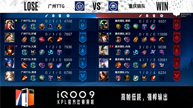 开局54秒广州TTG发育路击杀马可波罗拿到一血。1分31秒重庆狼队暴君处击杀澜。2分11秒重庆狼队打出0换2。3分35秒重庆狼队拿下暴君。3分43秒广州TTG拿下主宰。5分04秒重庆狼队摧毁中路外塔并击杀蒙恬。6分29秒重庆狼队摧毁敌方对抗路二塔。7分11秒野区团战广州TTG击杀廉颇。7分53秒重庆狼队拿下暴君。8分24秒重庆狼队摧毁敌方中路二塔。8分39秒重庆狼队摧毁敌方发育路二塔。10分27秒重庆狼队拿下暗影主宰。12分28秒重庆狼队发育路击杀澜。12分52秒重庆狼队摧毁敌方中路高地塔。13分03秒高地团战双方1换1。14分21秒重庆狼队摧毁敌方对抗路高地塔。16分29秒中路团战广州TTG打出0换2。17分21秒广州TTG拿下暗影主宰。17分56秒对抗路团战重庆狼队打出2换3。18分35秒重庆狼队摧毁敌方水晶拿下比赛。