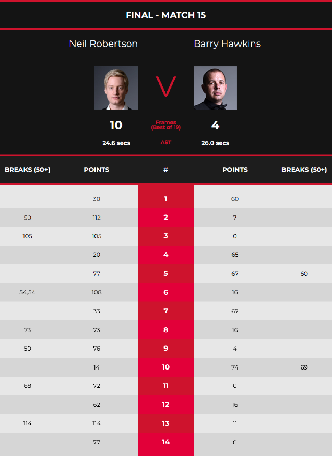 本场比赛采用19局10胜制,分为2个阶段进行。第一阶段开始后,霍金斯的表现并不算差。首局,他通过多次上手,以60-30先下一城,大比分1-0领先。不过此后2局,尼尔-罗伯逊连续打出单杆50分和105分,以112(50)-7和105(105)-0连胜2局,将大比分反超为2-1。第四局,霍金斯再次通过多次上手,以65-20获胜,大比分2-2平进入中场休息。