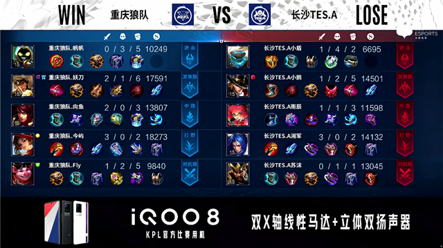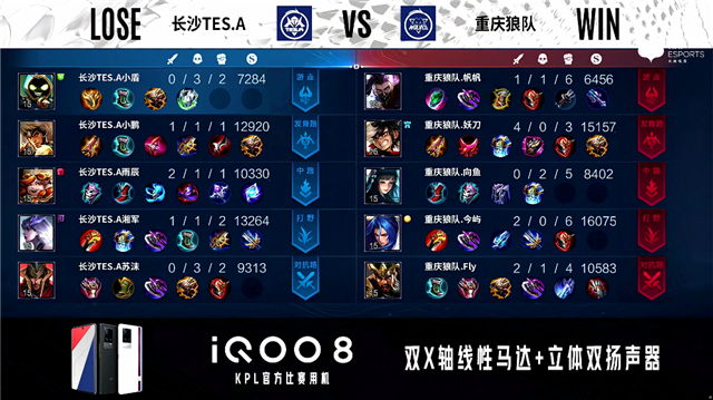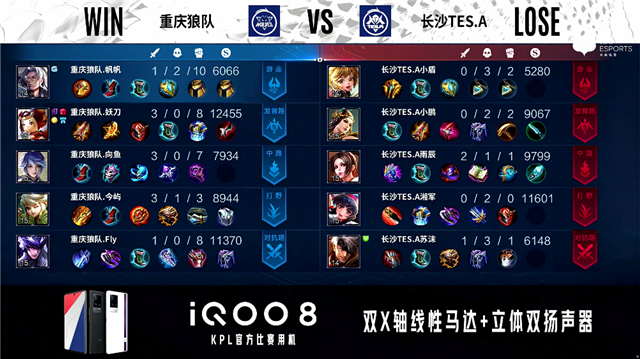 2分22秒,下路团,长沙TES.A打出1换2。3分35秒,重庆狼队下路击杀盾山,随后长沙TES.A安琪拉蹲草击杀太乙真人。5分20秒,长沙TES.A控下暴君。5分40秒,下路团,重庆狼队击杀盾山。8分23秒,长沙TES.A控下先知主宰。8分50秒,中路双方辅助互换。10分15秒,重庆狼队控下暗影主宰,随后击杀马可波罗。12分31秒,重庆狼队破掉长沙TES.A下二塔。14分40秒,重庆狼队控下暗影主宰。14分58秒,长沙TES.A破掉重庆狼队下二塔。16分15秒,重庆狼队破掉长沙TES.A中一塔。16分35秒,重庆狼队控下暗影暴君。17分47秒,重庆狼队破掉长沙TES.A上二塔。19分10秒,重庆狼队控下暗影主宰。20分13秒,重庆狼队击杀安琪拉。20分34秒,重庆狼队控下风暴龙王。21分15秒,重庆狼队破掉长沙TES.A中二塔。22分26秒,重庆狼队破掉长沙TES.A上高地。22分40秒,重庆狼队破掉长沙TES.A中高地。22分58秒,重庆狼队边团边拆摧毁长沙TES.A水晶赢下比赛。