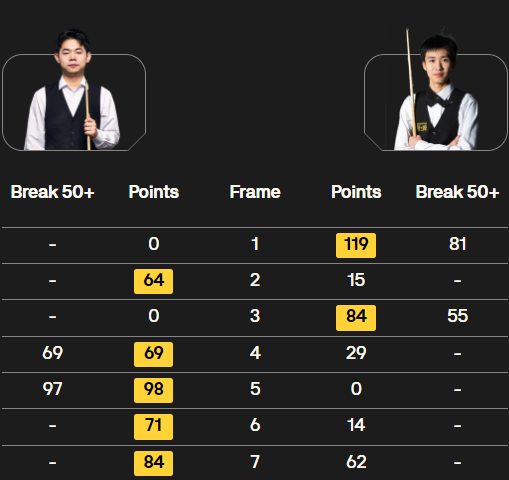 第四局:袁思俊开始找到状态,他在这局中打出单杆69分,以77:39扳回一局,将总比分改写为1-3。