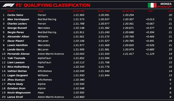 足球直播吧讯 2023年F1意大利大奖赛排位赛,塞恩斯收获赛季首杆,帮助法拉利在蒙扎主场锁定杆位。维斯塔潘第二,勒克莱尔第三!P4-P10依次为,拉塞尔、佩雷兹、阿尔本、皮亚斯特里、汉密尔顿、诺里斯、阿隆索。