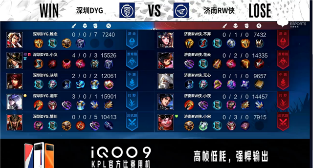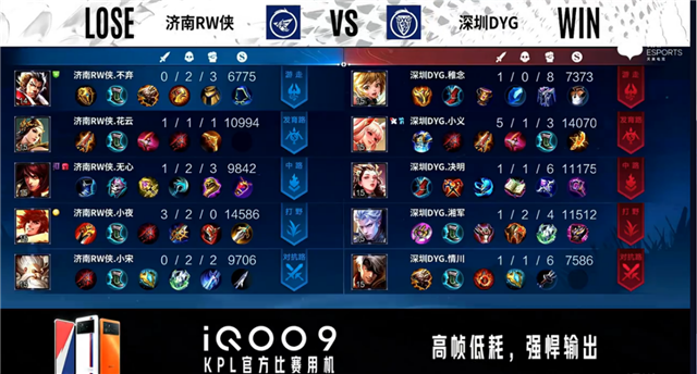 2分25秒,深圳DYG拿下先知主宰。3分49秒,暴君团,深圳DYG打出2换4。5分35秒,深圳DYG上路击杀苏烈后破掉济南RW侠上一塔。7分06秒,深圳DYG拿下主宰。9分03秒,深圳DYG拿下暴君。9分26秒,济南RW侠中路击杀沈梦溪。10分17秒,深圳DYG控下暗影暴君。10分13秒,深圳DYG破掉济南RW侠上二塔,随后控下暗影主宰。11分40秒,中路团,双方打出1换1。12分50秒,深圳DYG破掉济南RW侠下二塔。14分09秒,深圳DYG拿下暗影暴君。14分36秒,济南RW侠中路击杀梦琪。15分20秒,中路团,济南RW侠打出0换1。16分32秒,深圳DYG控下暗影主宰。17分12秒,深圳DYG破掉济南RW侠中二塔。17分40秒,深圳DYG中路击杀关羽。20分钟,野区团,济南RW侠打出0换2。20分40秒,济南RW侠下路击杀梦琪。21分10秒,济南RW侠击杀盾山后拿下风暴龙王。21分46秒,济南RW侠破掉深圳DYG下路高地塔。22分52秒,济南RW侠先后破掉深圳DYG中路高地塔和上路高地塔,随后高地团深圳DYG打出1换2。24分43秒,深圳DYG控下风暴龙王。25分19秒,高地团,深圳DYG团灭济南RW侠后推掉水晶赢得了本场比赛的胜利。
