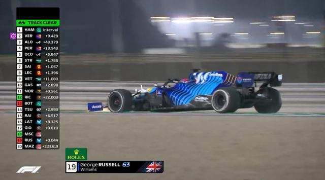 卡塔尔大奖赛正式开跑,发车第一弯,汉密尔顿守住第一位,阿隆索在几个弯角之后过掉加斯利,升至第2位,第7位发车的维斯塔潘接连超越3位车手,上升至第4位。第6位发车的博塔斯发车比较糟糕,连丢5个位置,下降到第11位。