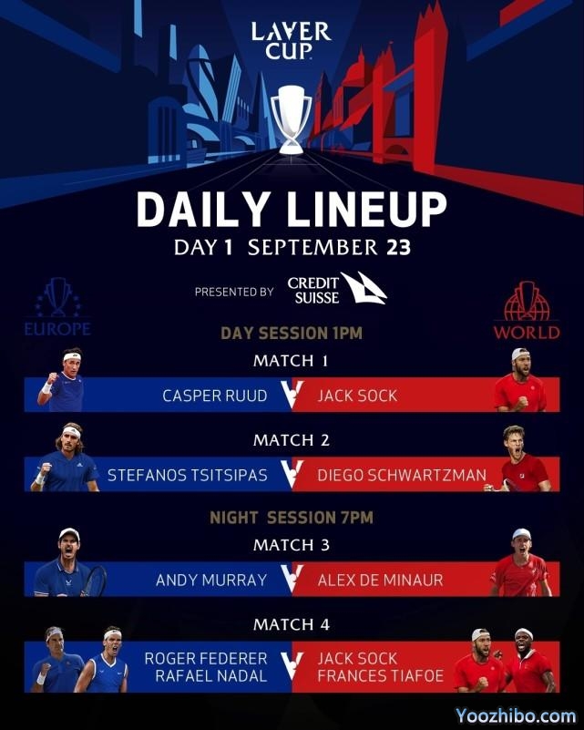 在拉沃尔杯首日赛程中,第一场欧洲联队派出的是前不久美网夺得亚军的挪威人卡斯帕-鲁德,他将迎战世界联队的对手是美国名将杰克-索克。第2场,欧洲联队派出的希腊人西西帕斯,他的对手是阿根廷好手施瓦泽曼。在首日晚场的较量中,3座大满贯得主、英国人安迪-穆雷将与澳大利亚名将德米纳尔过招。