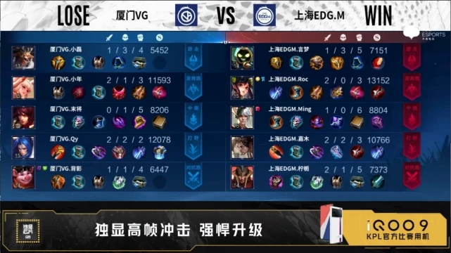 开局双方正常抢线。1分38秒中路上海EDG.M击杀兰陵王,拿下一血,双方打出1换1。3分05秒上海EDG.M拿下暴君,河道击杀沈梦溪,打出0换1。4分17秒野区上海EDG.M击杀兰陵王。5分24秒河道团战上海EDG.M娜可露露二连击破,打出1换2,摧毁敌方发育路外塔。6分23秒上海EDG.M拿下主宰。7分11秒发育路上海EDG.M打出1换1,摧毁敌方发育路二塔、中路外塔。8分59秒上海EDG.M拿下暴君,野区团战上海EDG.M击杀兰陵王,打出0换1,摧毁敌方对抗路外塔,拿下暗影主宰。10分26秒厦门VG摧毁敌方发育路外塔,上海EDG.M摧毁敌方对抗路二塔。11分06秒发育路上海EDG.M击杀李元芳,摧毁敌方发育路高地,打出1换2,摧毁水晶拿下比赛。