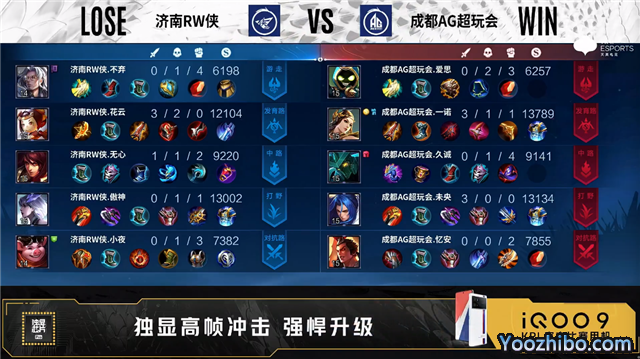 双方常规开局。46秒济南RW侠发育路击杀马可波罗拿到一血。2分24秒成都AG中路击杀不知火舞。2分46秒成都AG拿下暴君。3分43秒济南RW侠拿下主宰。5分36秒成都AG摧毁敌方中路外塔。5分47秒济南RW侠摧毁敌方发育路外塔。8分53秒成都AG摧毁敌方对抗路外塔。7分17秒济南RW侠拿下暴君。9分10秒野区团战济南RW侠击杀盾山。9分58秒中路团战济南RW侠打出1换3,曜拿到三连决胜。12分24秒野区团战成都AG打出1换3。14分43秒野区团战成都AG打出0换2。15分24秒成都AG拿下暗影暴君。16分10秒成都AG摧毁敌方中路二塔。17分09秒济南RW侠对抗路击杀盾山。18分07秒对抗路团战成都AG打出0换5。18分55秒成都AG摧毁敌方水晶拿下比赛。
