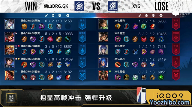 双方常规开局。1分50秒XYG对抗路击杀廉颇拿到一血。2分05秒XYG发育路击杀公孙离。3分35秒XYG中路单杀西施。5分22秒双方2换2。5分35秒XYG摧毁敌方中路外塔。6分05秒佛山DRG.GK野区击杀李元芳。7分48秒XYG中路击杀澜。8分03秒XYG拿下暴君。9分38秒佛山DRG.GK中路击杀项羽。10分32秒佛山DRG.GK拿下暗影主宰。11分04秒双方中路1换1。11分19秒XYG拿下暗影暴君。12分06秒佛山RRG.GK摧毁敌方中路外、二塔。14分48秒中路团战XYG打出0换2。15分19秒XYG拿下暗影主宰。15分39秒XYG摧毁敌方对抗路高地塔。18分06秒野区团战双方1换1。20分26秒佛山DRG.GK龙王处击杀不知火舞。21分03秒龙王处双方1换1。22分25秒佛山DRG.GK拿下风暴龙王,团战佛山DRG.GK打出0换2。23分25秒发育路团战XYG打出1换2。26分14秒龙王处团战佛山DRG.GK打出0换3。27分02秒佛山DRG.GK团灭对手摧毁水晶拿下比赛。