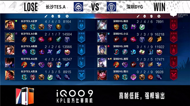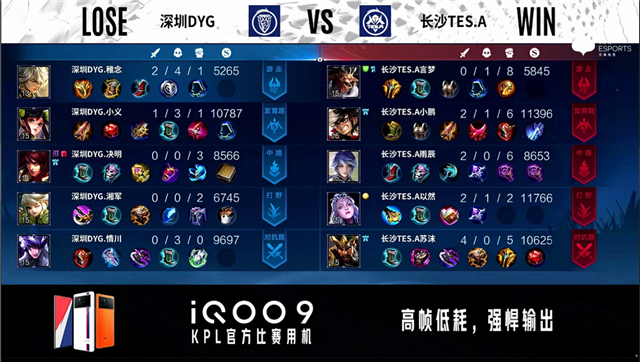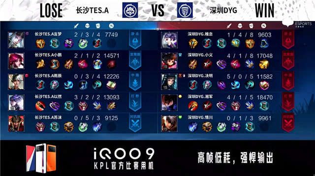 1分16秒,中路团,深圳DYG打出2换4,西施拿下三杀。2分57秒,深圳DYG中路击杀嬴政,随后拿下暴君。4分24秒,下路团,双方1换1。5分08秒,深圳DYG上路越塔击杀蒙恬破掉长沙TES.A上一塔,随后控下先知主宰。6分44秒,长沙TES.A下路打出0换2。7分27秒,深圳DYG拿下暴君,随后长沙TES.A破掉深圳DYG上一塔。9分钟,深圳DYG接连破掉长沙TES.A上二塔和下一塔。10分20秒,深圳DYG拿下暗影主宰。11分05秒,深圳DYG破掉长沙TES.A下二塔。11分25秒,深圳DYG破掉长沙TES.A中一塔,随后野区击杀蒙恬。12分15秒,深圳DYG破掉长沙TES.A中二塔,随后控下暗影暴君。14分04秒,深圳DYG拿下暗影主宰。16分12秒,深圳DYG拿下暗影暴君。17分53秒,深圳DYG拿下暗影主宰。19分12秒,深圳DYG上路击杀蒙恬。21分钟,风暴龙王团,深圳DYG打出2换4。21分40秒,深圳DYG下路击杀蒙恬后一波摧毁水晶拿下本场比赛的胜利。