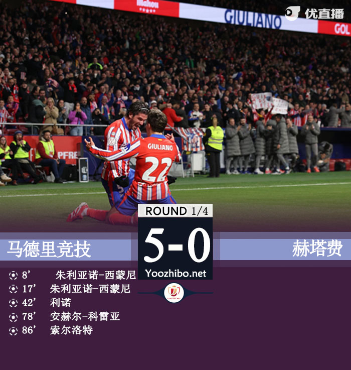 马竞5-0赫塔菲晋级四强 小西蒙尼双响科雷亚传射建功
