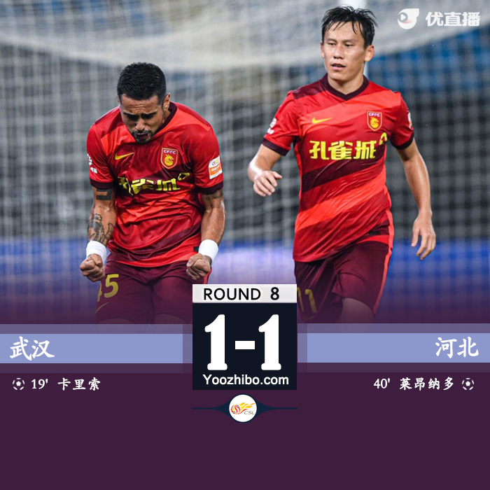 足球直播吧8月15日讯 北京时间8月15日19:30,中超第8轮补赛,武汉对阵河北。上半场,胡人天推射击中立柱,赵宏略传中中柱后卡里索补射建功,莱昂纳多反越位扳平抽射比分。下半场,么旭辰劲射被扑出,此后双方机会寥寥均无建树。全场比赛结束,河北队1-1战平武汉队,排名苏州赛区第4,进入争冠组。